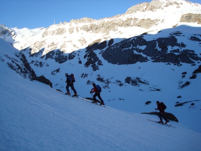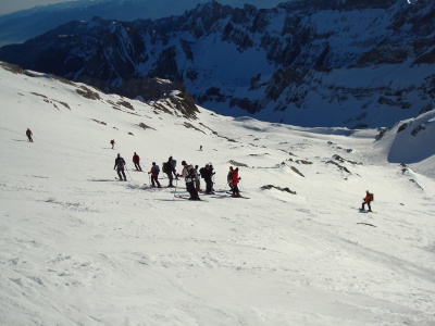 Skitour mit Bahnhilfe bei frühlingshaften Temperaturen. Die 16 Teilnehmer